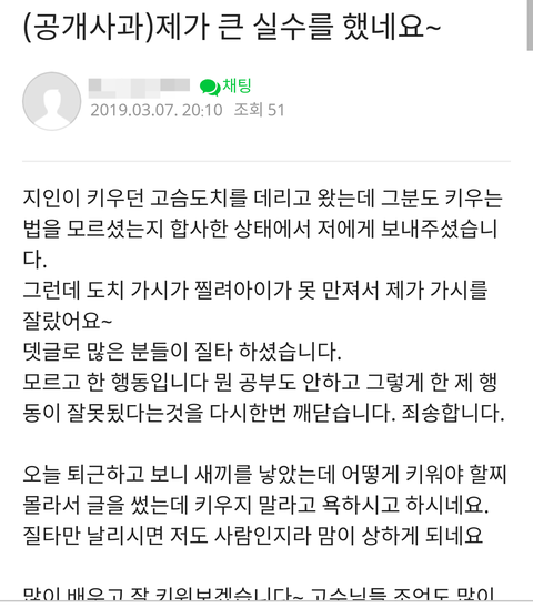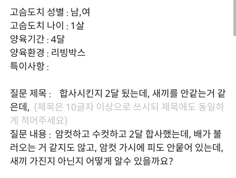 교배, 출산 후 관리의 경우 조금만 검색해도 나올 수 있는 부분인데 공부할 생각도 전혀 없으며 교배를 위해 합사 2달 이상 했음에도 아무것도 모르는 게 정말 어이없음. 게다가 새끼 3마리를 낳았으나 그중 하나는 이미 별에 갔다고 함.