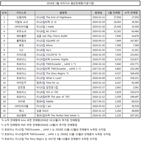 드림캐쳐가 2월 여자 가수 중 가장 많은 앨범을 판매함.드림캐쳐의 첫 달 판매량 추이는 이렇게 나옴17.01 싱글 Chase Me : 1,51317.04 싱글 GOOD NIGHT : 8,346 17.07 미니1집 날아올라 (Fly high) : 5,785 18.05 미니2집 YOU AND I : 22,550 18.09 미니3집 What : 23,147 19.02 미니4집 PIRI : 27,958 점점 상승하는 중.