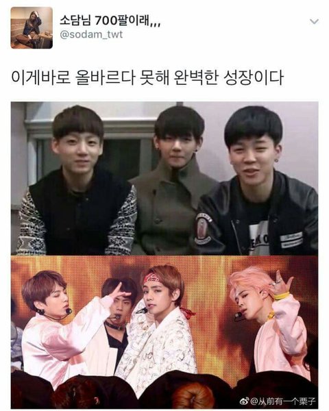 구오즈!!! 음...어........진짜 바람직하게 잘컸다ㅋㅋㅋㅋ진짜 멋있어진 모습이야. 특히 지민이는 볼살 엄청 빠졌고 태형이는 특유의 귀여운 분위기가 싹 빠지고 성숙미 물씬