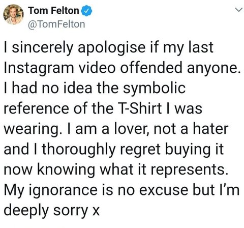 톰 펠튼은 " 내가 입고 있는 티셔츠의 상징적인 의미를 전혀 몰랐다 . 그 의미를 이제야 알았고 그 옷을 산 것을 완전 후회한다 " 며 " 내 무지함은 변명거리가 안된다 . 깊이 반성 중 " 이라고 사과했다 .