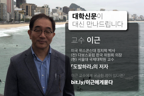 안녕하세요. 서울대학교 『대학신문』입니다. 『대학신문』은 이번 학기 독자가 만나고 싶은 인물을 대신 만나는 코너를 준비하고 있습니다. 지난 2월동안 진행했던 설문 조사를 바탕으로 컨택을 진행한 결과 이근 교수(국제대학원)와 인터뷰를 진행하게 됐습니다. 이번 설문에선 이근 교수에게 묻고 싶은 질문을 수합한 후, 실제 인터뷰에서 기자들이 질문을 드릴 예정입니다. 많은 참여 부탁드려요.