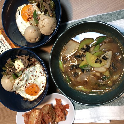 만들어논 계란, 소고기 장조림을 처치하고자 비빔밥 만들고 우렁이 깨끗하게 씻어서 된장찌개 끓여 같이 먹었어요. 장조림이야 말로 만들땐 귀찮지만 만들어 놓고 나면 일주일이 든든한 실비보험 같은 존재랄까요.