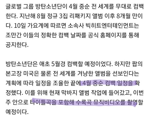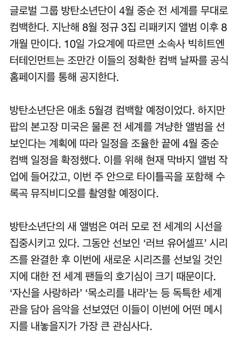 방탄 4월 중순 컴백