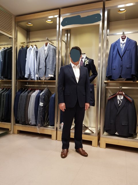 (추가)좋으신 의견 감사합니다.일부 경망스럽다는 분들도 계셨지만 많은분들이 괜찮다고 하시는데 용기를(?)내어 유행대로 몸에 맞는(?)옷을 골라보려 합니다. 그리고 구두는 매장의 슬리퍼고 매장에서 옷을 임시로 입은거라 넥타이는 안한겁니다..결혼식에선 당연히 검은구두에 넥타이 차림이죠..댓글 감사합니다