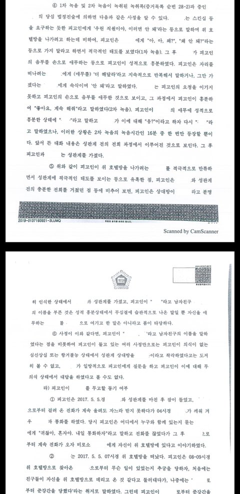 거기를 어떻게 간 건지도 모르겠고, 처음에 눈을 떴을 때 어딘지도 못 알아봤습니다. 사건 기록을 보니 1차 들어간 시간이 7시 40분이고, 호텔에 들어간 시간은 10시 30분 정도에요. 중간중간 기억나는 정도가 잠이 든 것 같은 느낌이었는데 온몸에 힘이 하나도 안 들어가고 눈조차 뜨기가 어려웠습니다. 그냥 못 떴어요. 누군가 내 몸을 만지고 성관계를 한다는 느낌은 들었는데 저는 잠결에? 남자친구 인 줄 알고 OO아 이름을 부른 것 같아요. 계속 자다 깼다 하는 것처럼 정신이 하나도 없었어요. 그러다 완전히 잠든 것 같은데 중간에 누가 막 저를 깨우더라구요. 눈 떠보니 국장이 있었고 엄청 당황스러웠습니다. 갑자기 제 폰을 주더니 새벽에 갑자기 연락이 안돼서 걱정된 남자친구가 계속 전화를 했더라구요. 저에게 전화를 바꿔주는 겁니다. 저는 정말 도대체 무슨 상황인지 하나도 모르겠고, 정말 제가 횡설수설하니 남자친구가 어디냐 물어봐서 거기가 어딘지 몰라 방안을 둘러보니 국장은 이미 나가고 없었고 방에 카드 키를 보고 어딘지 알았습니다.