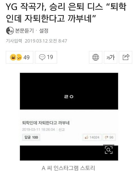 전 YG 프로듀싱 테디가 승리 디스함