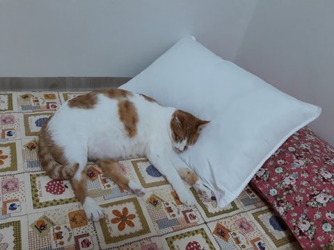 집사가 사용할 새로산 베개를 먼저 사용해봄.