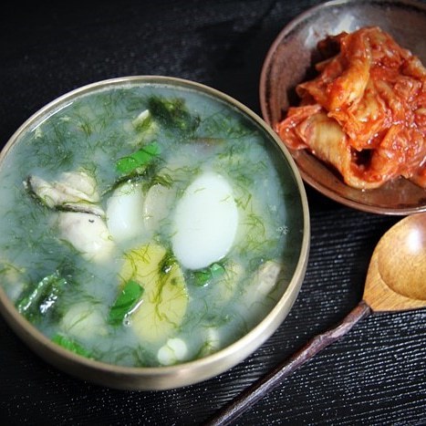 "매생이 떡국인께 얼른 묵어봐라잉 석화도 많이 넣었을께 배고픈디 얼른묵어"
