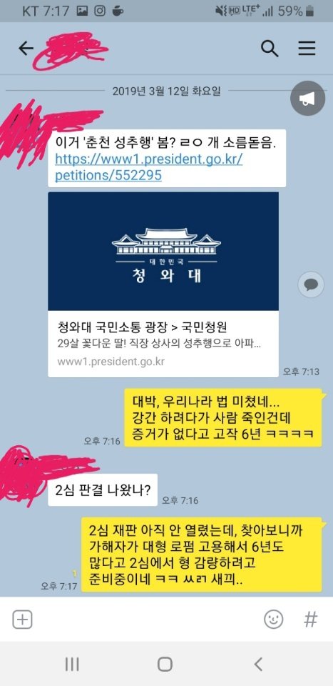 지금 범국민적으로 청원 동의해서 가해자 사회로 못 나오게 하자는 의견이 있는데..아래 내용 한 번 확인해보세요. 사건에 대한 자세한 전말이 나와있습니다.깊은 빡침 조심하시고요.. 하.......................춘천 성추행..하ㅏ...