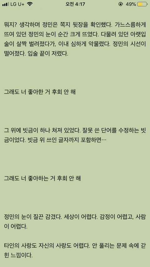와.. 미쳤잖어... 맘아파 ... 유진 삼촌 손에도 놀아나고 정민이 손에도 놀아났고.. 정민이 좋아할 뿐인 앤데.. 진짜 너무 슬프다 ㅜㅜㅜㅜ 짝사랑 감정이입돼.. 정민이가 유진이랑 관계 끊으려고 엄청 상처주는 말 한 이후 상처 받아서 알아서 하라면서 갔는데 적어둔 쪽지에 너 좋아하는 거 후회 안한다니.. 하.. 맘아프고 그르네.. 제발 유진 선택해줘.. 정민아 .. 어리고 잘생긴애 ..