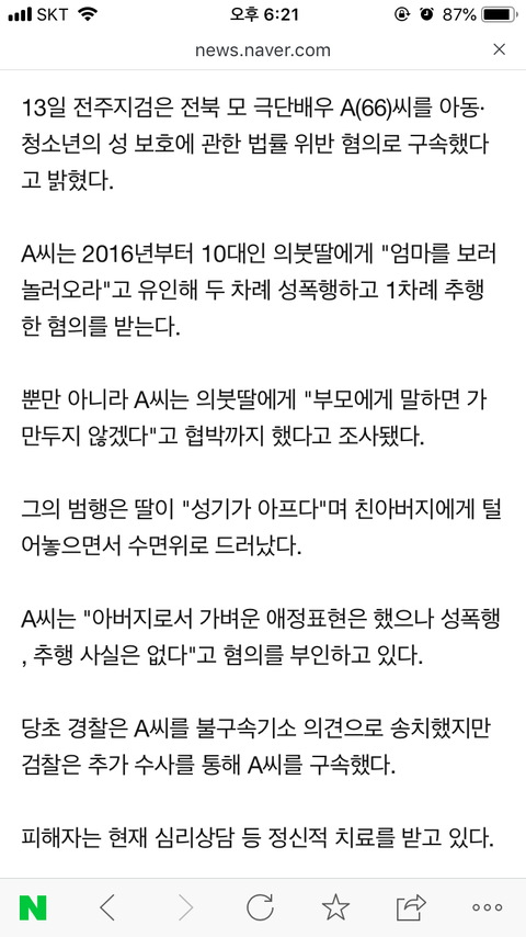 진짜 미친거아님? 몇번 안보는 엄마 못 볼까봐 성폭력 숨겼대... 진짜 마음아프다 성폭행 법 좀 강화 됐으면 좋겠어 너무 소름끼쳐