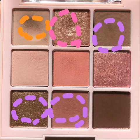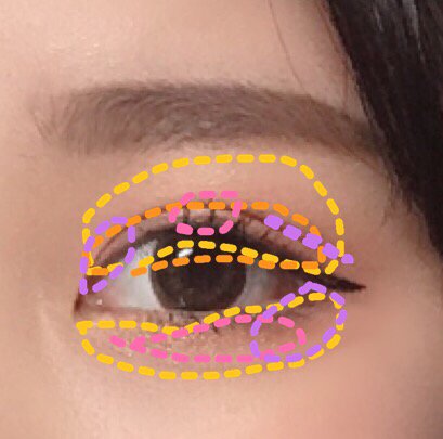 먼저 만다린에이드로 눈두덩이랑전체 애굣살포함 깔아주고 피치씨 첫번째컬러로 쌍커풀라인이랑 애굣살 살짝 칠해주고 두번째컬러로 눈 중앙부분이랑 애굣살에 칠해주고 저 보라색 세가지 컬러 다 섞어서 앞부분이랑 뒷부분 쌍커풀라인에 칠해줘 !!! 블렌딩 하지말고 쌍커풀라인을 또렷하게 해준다는식으루 !! 아 글구 삼각존도 아주 살짝 칠해주면 돼 ㅎㅎ!!