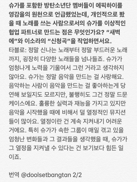 어떤일이고 계속하다봄 매너리즘에 빠지는데 슈가의 열정이 그걸 이겨내는듯!!멋지다 민슈가