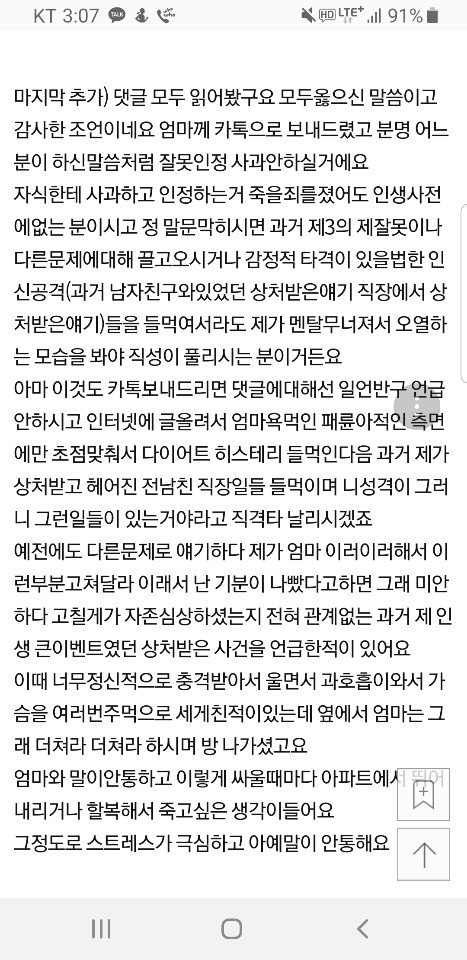 추가로 아까 이 커뮤니티 둘러보다가 다른 썰에서 본 다른분 어머니 성격인데정말 저희어머니가 생각나서 첨부합니다.