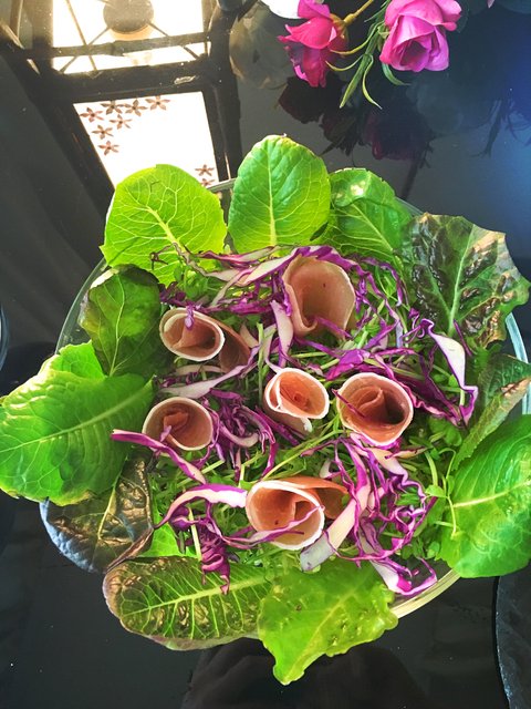 기른 상추에 프로슈토햄과 양배추를 함께.