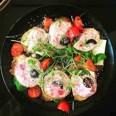 크림치즈, 식빵,새싹,블랙 올리브,미니토마토,파르메산 치즈 파우더