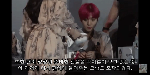 팬이 준 선물 팬매니저가 돌려줌(지가뭔데 2222) 심지어 다시 지훈이 손에 쥐어주니까 또 다시 못주게 돌려줌...박쥰 표정=내표정