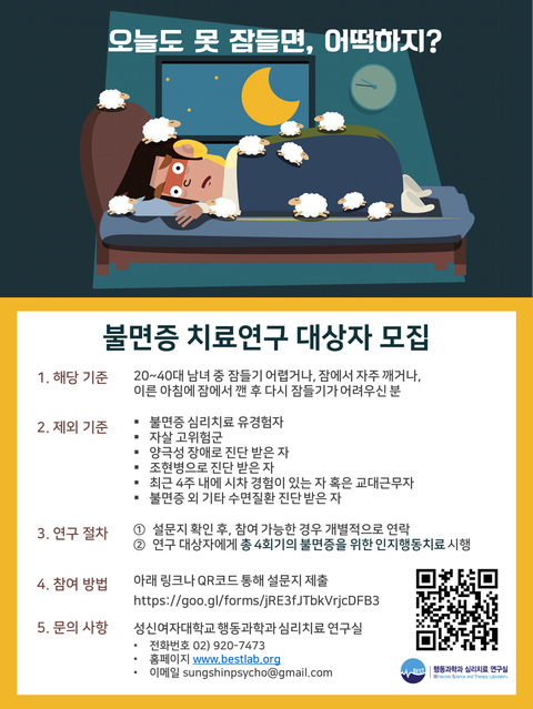저희 연구실에서는 불면증 치료 연구를 위해 현재 불면증으로 잠들기 어려운 분들을 모집하고 있습니다.