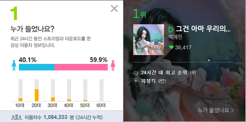 JYP에서 이런 음원기록 나온적이 없었음...백예린은 진짜 독보적인게 백예린을 제외하고 다른 제왑가수들은 지붕킥 8회에다가 이용자수 100만을 넘겨본적이 없음(원더걸스나 트와이스는 멜론 1위는 많이 했어도 이용자수 80만, 지붕킥 1~2회 정도 했었지)