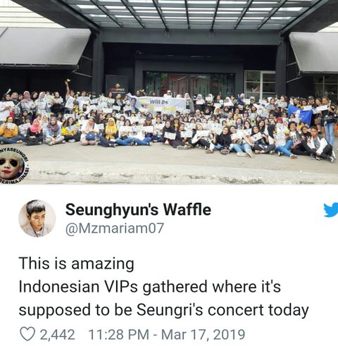 그와중에 승리가 인도네시아에서 공연하기로 했던 날에 모인 인도네시아 팬들 모여서 기념하고 승리 응원 중.