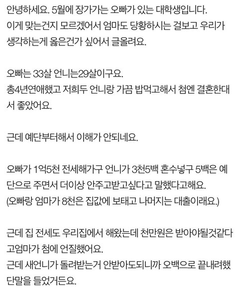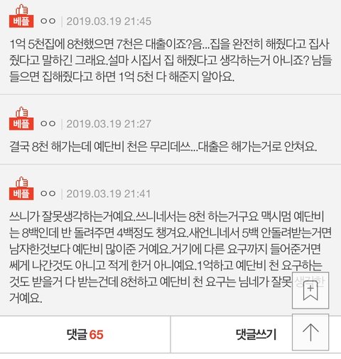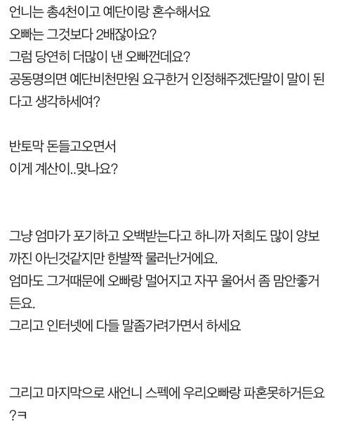 가정주부가 왜 공짜로 사는거지? 법원에서 재산분할기여도도 다 인정해주는데요. 그 아마존 ceo도 결혼후 형성된 재산이라 재산분할로 아내에게 절반인 76조 줘야 한다는 전망 나오는 마당에? 이게 왜냐고요? 부부중 한쪽이 살림이랑 육아를 전담해주지 않았으면 결코 한쪽이 이룰수 없었던 성과라고 보기때문이죠. 그리고 여자는 연하랑 딩크할거 아니면 반반결혼하는거 그거 반반아니에요. 여자가 더 해가는 결혼이지(하면 안된다는거 아님ㅇㅇ 자유국가인데 좋으면 돈 더주고라도 하는거지 그냥 더해가는 거라는거일뿐) 그렇다고 뭐 남자쪽에서 일방적으로 수십억한다면야 로또 맞는건가 싶지만 님네는 그것도 아니고 다 따지면 4천정도 더하는거 아님?