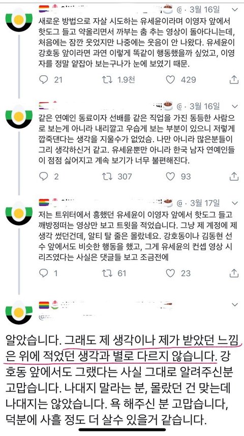 이건 뭔소리인지,, 유세윤이 남자들한테도 똑같이하는건 알겠지만 내 생각은 변하지않았다...?