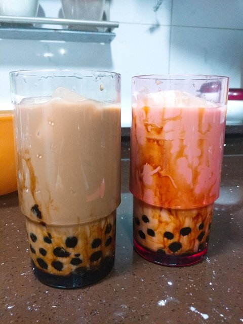 우유 한컵에 파우더를 원하는 만큼 넣고 녹임(펄이 달아서 좀 덜달게 해도 됨) 그리고 긴컵에 졸인 펄을 두세국자 넣고(뜨거울때 넣음) 그위에 만들어놓은 밀크티를 부음 그리고 얼음몇개 넣으면 드디어 완성!