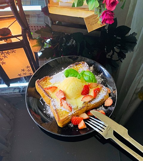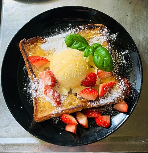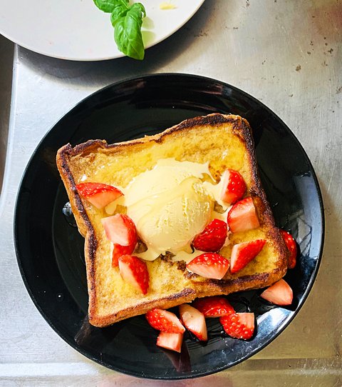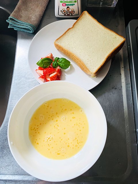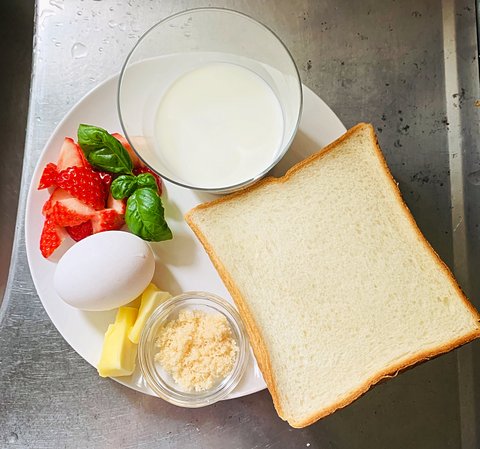 식빵1 계란1 우유 약50ml 설탕 취향것,딸기 외 좋아하는 과일, 허브는 취향, 꿀,바닐라 아이스크리 또는 휘핑크림,슈가파우더, 버터