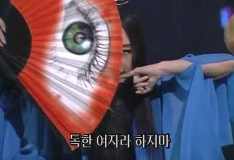한복 입고 손가락 마이크에 눈동자 그려진 부채