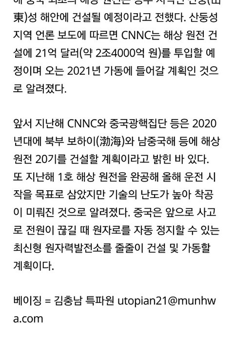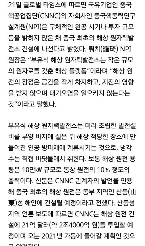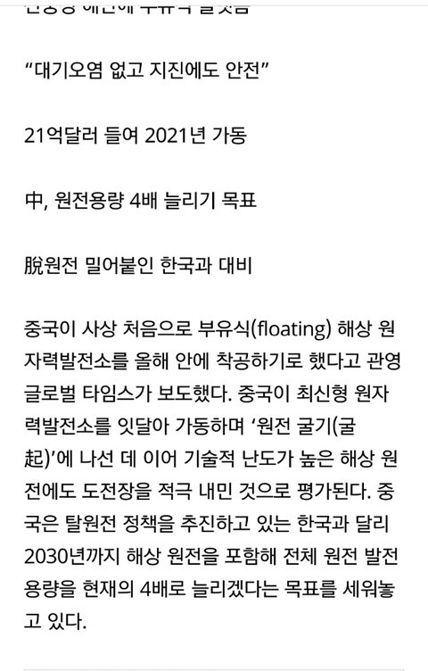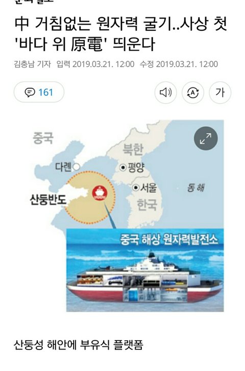 중국이 우리나라하고 가까운 산둥반도 쪽에 공장이랑 화력 발전소랑 원전이랑 대량으로 옮겨놔서 안그래도 우리나라에서 피해입고 있잖아 근데 중국에서 2021년까지 우리 나라 서해 바다에 해양 원전 설치한대