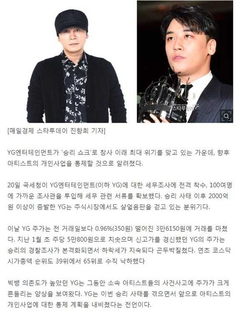 `승리 쇼크` YG, 소속 아티스트 개인 사업 통제한다