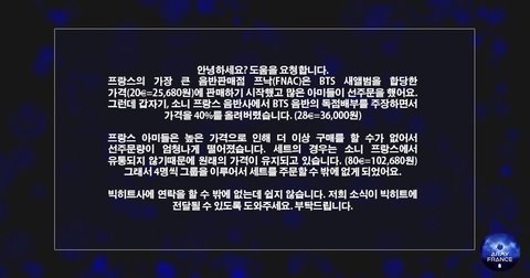 많은 아미분들이 도와주셨으면 해서 이렇게 네이트판으로 sos 하게 됐어 프랑스 음반판매점에서 처음에는 정당한 가격으로 선주문을 하게 되었는데.. 갑자기 독재로 가격 상승을 터무니 없는 가격으로 올려서 프랑스 아미들이 주문을 못하고 있는 상황이 왔는데..프랑스 아미들이 정당한 가격으로 살 수 있게 도와줬으면 해..