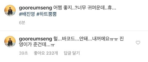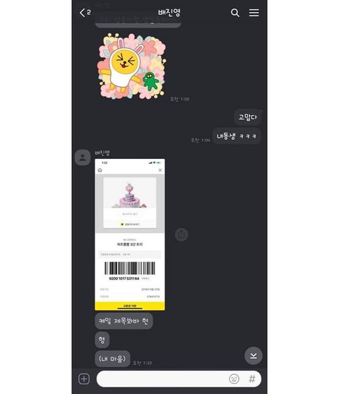 형한테 카톡으로 예쁜 짓하는 진영이도 귀엽고ㅋㅋ 진영이 귀엽다고 기프티콘 바코드도 안가리고 인스타에 올려버린 상머글 성운이도 귀여워ㅋㅋㅋㅋㅋㅋㅋ