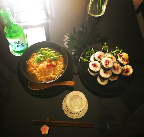 라면에 김밥도 말아본다. 참기름 냄새에 코도 호강한다.