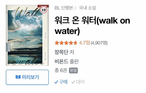 일단 제목은 앞서 말했다시피“Walk On Water“임. 현재 웹툰으로는 시즌1이 종료 된 상태고 시즌2 존버중..책으로는 6권까지 있는데 3권부터가 본격 연애 시작이야!ㅠㅠ1~2권은 에드(주인수)의 절절한 짝사랑이 담겨있는데 작가님 감정묘사가 장난이 아니라서,, 맴찢가슴 움켜쥐고 봄.
