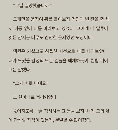 주인수 찌통구간 중 하나ㅠㅠㅠㅠ공이 자신의 문란한 생활을 들춰내며 수한테 상처주는,,ㅠㅠ(근데 나는 공이 수의 감정을 일찍이 눈치채고 일부러 밀어내는 것 처럼 보였어.)”그를 보는 나의 눈빛이 너무 열렬하지 않길 바랄 뿐이었다” 라니 이 문장 보면서 작가님 필력에 다시한번 감탄함 짝사랑 하는 감정을 이토록 처연하게 만들어내시다니,,