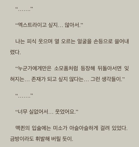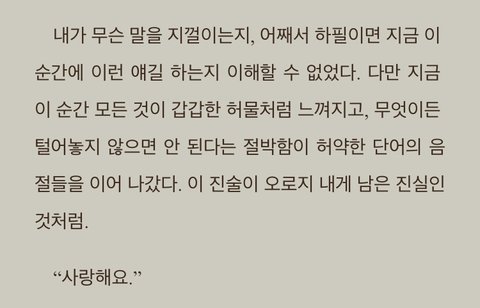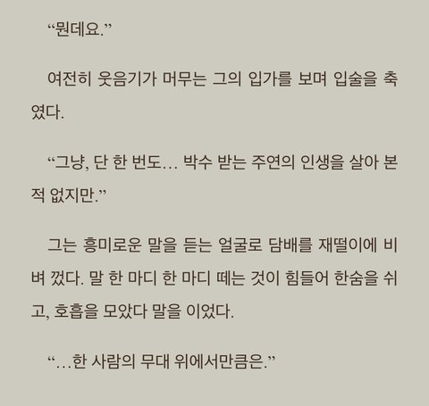 이 장면 툰으로 접했던 애들은 뭔 장면인지 rgrg? 솔직히 wow는 이 대사로 모든 걸 끝냈다고 보면 됨 “사랑해요”ㅠㅠㅠㅠㅠㅠㅠㅠㅠㅠ언제나 자기애로 힘겹게 살아가던 공의 무대 위에서만큼은 주연이고 싶다니,,솔직히 내 인생 고백씬이었어 툰에서는 수의 표정을 맛볼 수 있었다면 소설에서는 그 대사를 내뱉었을때의 감정을 온몸으로 맞을 수 있었음