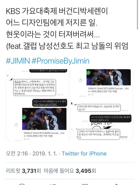이건 작년 kbs 지민의 솔로곡 무대를 보고 난리난 어느 디자인팀의 남팬. 참고로 이 무대보고 개그맨 남창희도 반해서 해피투게더에서 커버했었음