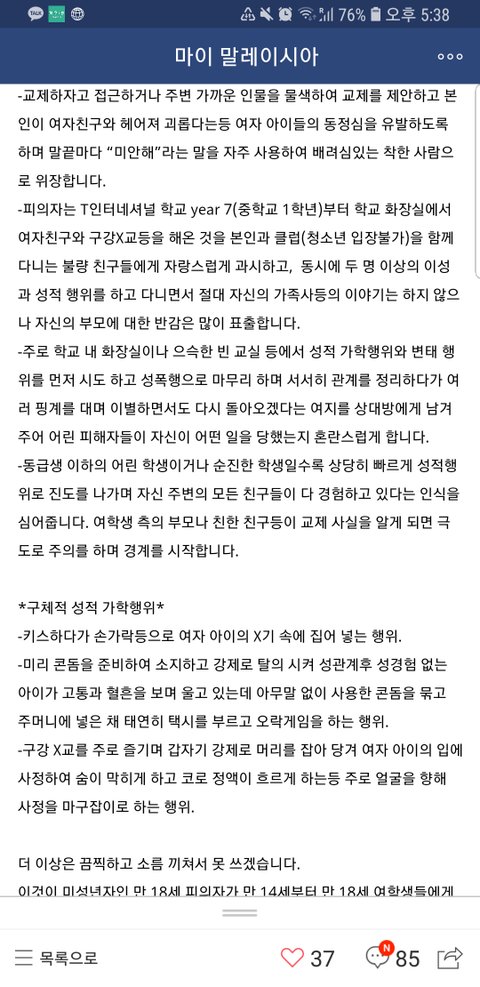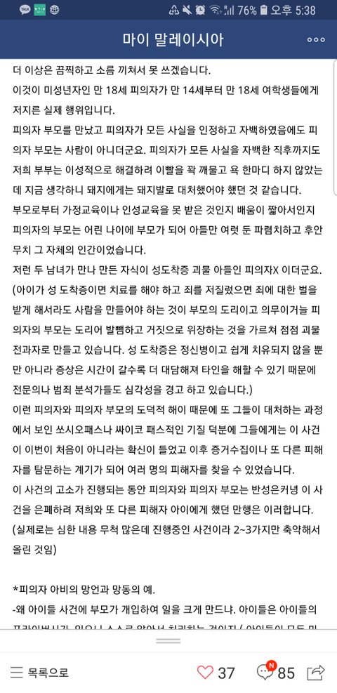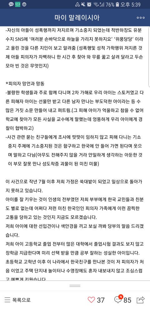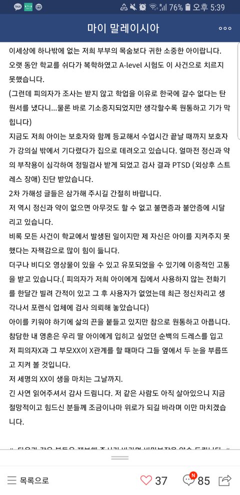 피해자는 1년 넘게 학교도 못다니고 정신과 치료를 받는데.. 피의자는 이곳에서 3만교민은 물론이고 현지인들도 거의 다 아는 거대그룹 아들이며.. 무엇보다 매일 그 회사에서 유통하는 한국물건들을 현지인,교민 할것 없이 이용할 수밖에 없는 곳이여서 그런지 너무 뻔뻔한 그들의 행동에 피해사실을 이곳까지 알리고 싶었던 큰 이유입니다.