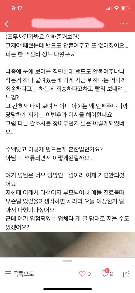 빼고 그걸 들고 대기실로 갔다가 간호사가 있길래 바늘 빼달라니까 도로 들어가서 기다리라고 했거든요 근데 기다리는동안 수액은 다 들어가고 피가 역류하기 시작했어요