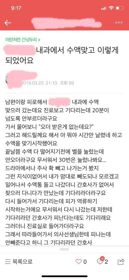 수액 다 맞아서가서 벨을 누르는데 안오길래 수십번을 눌러도 아무도 안오고