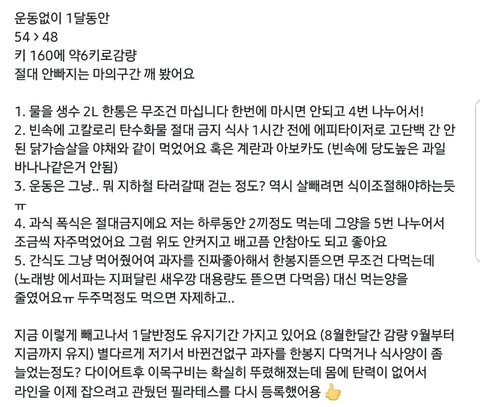 다이어트 관련 잘못된 내용 지적하자면 1. 생수 2L는 이렇다할 근거가 없어서 뭐가좋은지 잘 모르겠으니 패스 2. 탄수화물과 나트륨은 잘못 알려진 상식중에 하나, 탄수화물의경우 끊으라고 하는 이유는 탄수화물이 지방으로 바뀐다라고 알고있는데, 정확히는 탄수화물은 바로 활용 가능한 당으로 변경이 빠르기에 섭취를 못하게함, 운동을 안하는사람한테라면 단기적인 효과야 있을 수 있지만 우리 몸의경우 운동을안하고 혈당까지 떨어지면 혈당을 올리기위해 지방과 근육을 같이태움 따라서 결국 장기적으로는 근력량이 감소하고, 다시 탄수화물을 먹기시작하면 떨어진 기초대사량으로 인해 조금만 먹어도 확찌게됨 3. 운동을 하라고하는이유는 기초대사량을 늘리기 위해 하라고하는것임. 일반적인 유산소운동도 최소 근력량 유지에는 도움이 됨. 운동안하고 먹는것 줄이고 빼면 마른비만 ╋ 기초대사량 감소로 인해 나중에는 살이 쉽게찌고 살빼기 더 힘들어짐 4. 조금씩 나눠먹는건 배고픔을 덜 느낄 수 있는건 사실임, 근데 하루종일 위액이 분비되다보니 위가 약한사람은 속이 쓰릴 수 있음. 단기적으로 살뺄사람들은 조금씩 나눠먹는것 추천, 장기적으로 살뺄사람들은 그냥 평상시 식습관대로 정해진 시간에 드세요 5. 대부분의 간식들은 공기밥 1공기 이상의 칼로리를 가지고있음. 간식 드실거면 밥드세요 포만감 훨씬오래감..