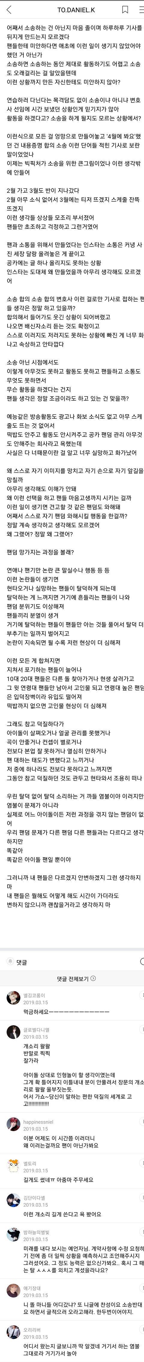 강다니엘 공카에 올라온 어느 한 팬의 절절문