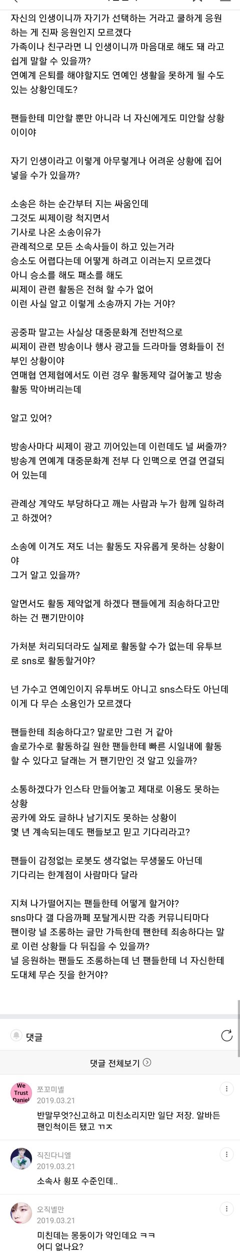 ㅂㅁㄱ 댓달지말고 신고한번씩 눌러주세요 참고로 이건 가처분 신청 전에 올라온 글임 지금은 소속사가 사기친게 드러났죠