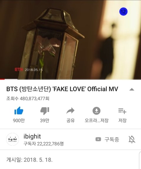 Fake Love 뮤비 좋아요 케이팝 최초로 900만 개 돌파