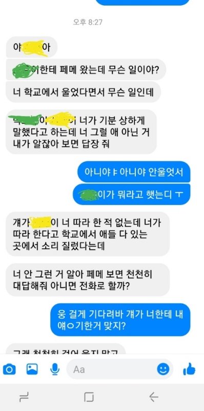추가 +) 생각버다 많이 봐줬네 ㅠㅜㅠ 오늘의톡 어제 떠서 놀랐어 내가 이번주 금요일에 현장체험을 간단말이야 그래서 옷을 사려고 했어 내가 아기자기한걸 좋아해서 그냥 새로 보세옷을 사려고 애들한테 물어봤어 오늘 쉬는시간에 내가 롱치마에 꼼x 가디건을 입는다 했어 근데 그 친구도 갑자기 롱치마에 가디건을 입겠다는거야 브랜드는 다르구 진짜 나한테 뭐 느끼나 싶어서 내가 말을 했어 왜 자꾸 따라하냐고 친구들 있는곳에서 처음부터 끝까지 내가 다 말했어 화장품 지갑 다 진짜 말하다가 어이없고 솔직히 생각해보니까 무서워서 나 눈물 많아서 울었더니 자기가 어이없다고 따라한게 아니라 나 쓰니깐 예뻐서 산건데 자기랑 같은거 쓰는게 그렇게 싫으냐 나보고 이기적이다 이런식으로 얘기하는거야 뭘 잘했다고 우냐고 나 쓰는중에 갑자기 전남친한테 페메 왔는데 그친구가 내 얘기 했나봐 ㅋㅋ 아 짜증난다 내 전남친인거 알거든 전에 만났을때 둘이 페친했고 조금 친해졌을꺼야 둘이 아마 전남친이랑 안좋게 끝난건 아니라 다행인데 지금 전화중이거든 걔가 페메로 내가 자기한테 뭐라했다고 혼자 피코한다고 얘기했다는데 어쩌면 좋을까 진짜 내일 싸울까????미친ㄴ년아니야 이정도면????