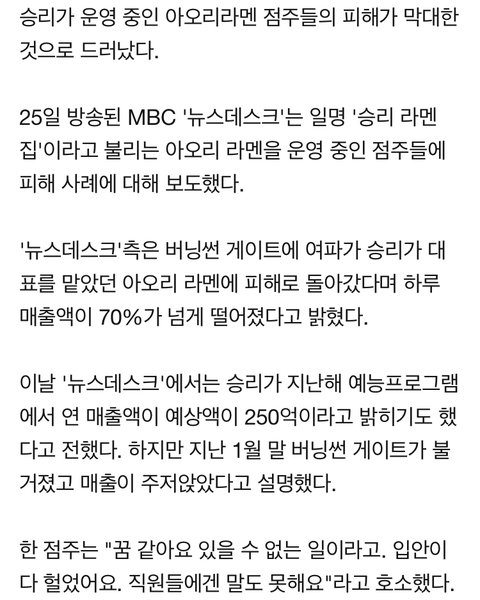 다 망하고 승리 저새끼가 가맹점주들한테 제대로 피해 보상해야지