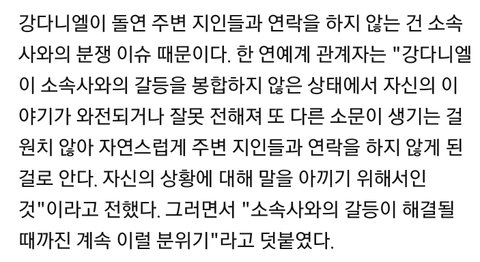 강다니엘이 돌연 주변 지인들과 연락을 하지 않는 건 소속사와의 분쟁 이슈 때문이다. 한 연예계 관계자는 "강다니엘이 소속사와의 갈등을 봉합하지 않은 상태에서 자신의 이야기가 와전되거나 잘못 전해져 또 다른 소문이 생기는 걸 원치 않아 자연스럽게 주변 지인들과 연락을 하지 않게 된 걸로 안다. 자신의 상황에 대해 말을 아끼기 위해서인 것"이라고 전했다. 그러면서 "소속사와의 갈등이 해결될 때까진 계속 이럴 분위기"라고 덧붙였다.