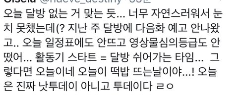 짹에서 오늘 달방 미리보기 안뜨는건 활동기 쉬어가는 타임아니냐 말이 있던뎈ㅋㅋㅋ 다들 그얘기 중임 진짤까 오늘 떡밥 소리가 들리는가아아
