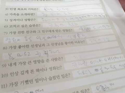지난 25일 오전 3교시 체육시간에 학교 5층에서 투신한 김모(15)군이 앞서 1교시 국어시간에는 자신이 가장 좋아하는 선생님을 '도덕선생님'이라고 썼다. [사진 김군 유족]